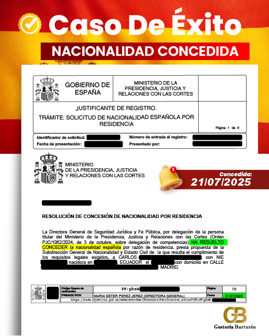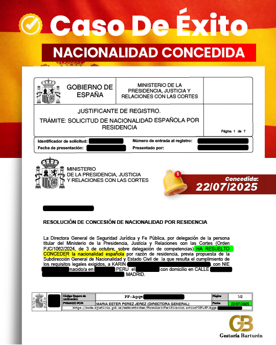 INICIO | CASOS DE ÉXITO RESIDENCIAS ESTANCIAS NACIONALIDAD Concesión de Nacionalidad de KARIN, Concedida: 22/07/2025 Concesión de Nacionalidad de CARLOS, Concedida: 21/07/2025 Concesión de Nacionalidad de Ouafae, Concedida: 02/05/2025 Concesión de Nacionalidad de Liliana, Presentada: 12/05/2023 Concesión de Nacionalidad de Juan, concedida en 8 meses Presentada: 30/08/2024 Concedida: 19/05/2025 Página 1 de 2 →