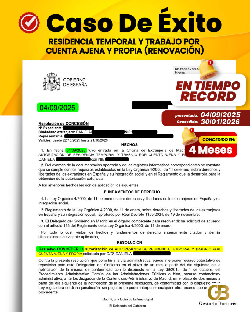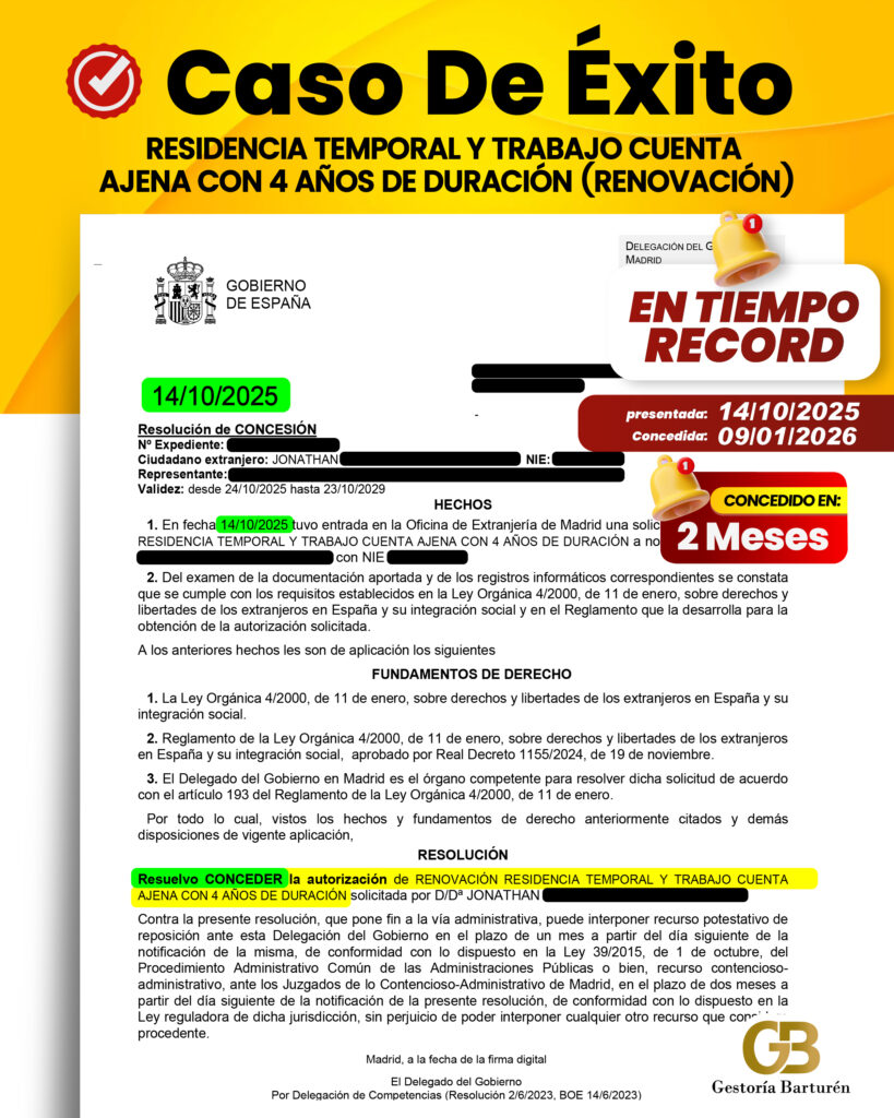 RESIDENCIA TEMPORAL Y TRABAJO CUENTA AJENA CON 4 AÑOS DE DURACIÓN (RENOVACIÓN)