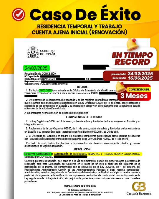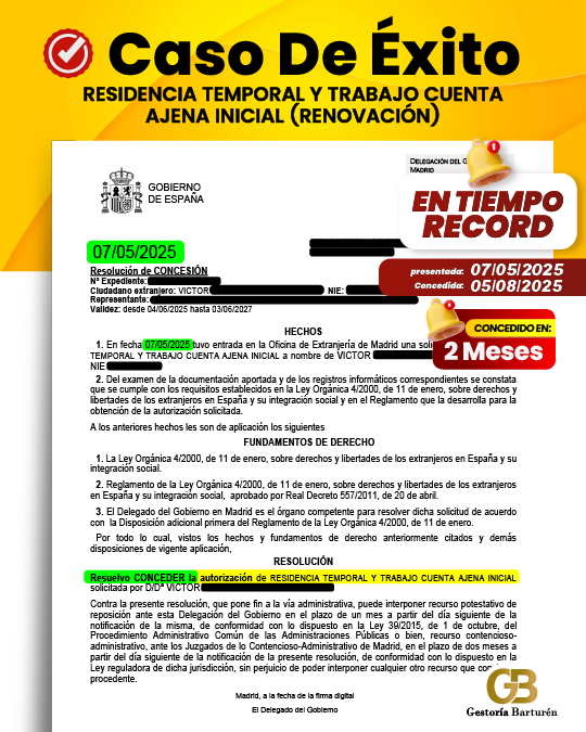 Caso de Éxito de SEGUNDO en 3 Meses, junto con nuestro asesor Yamir Burga. RESIDENCIA TEMPORAL Y TRABAJO CUENTA AJENA INICIAL (RENOVACIÓN)