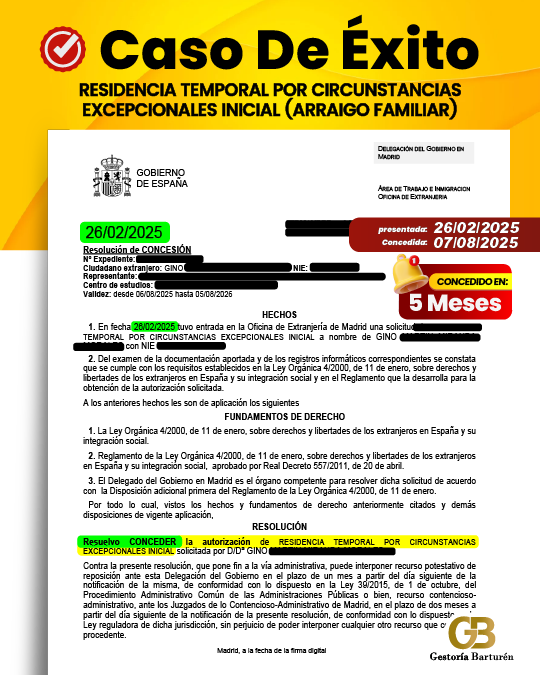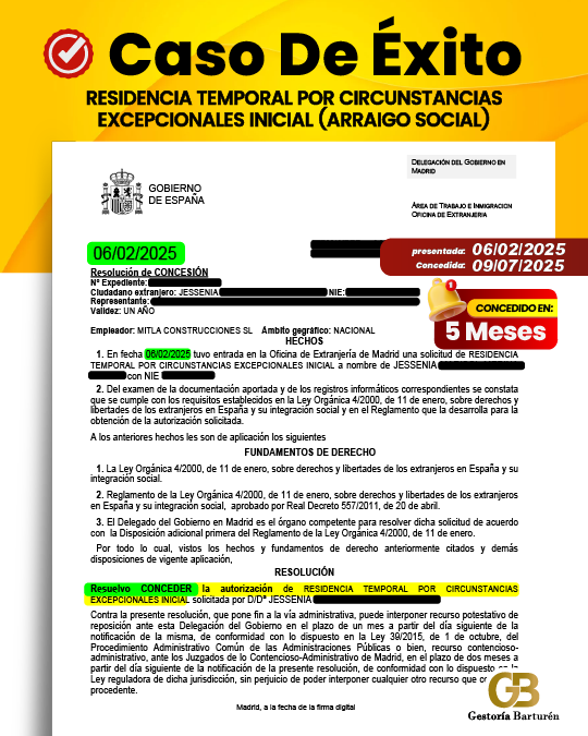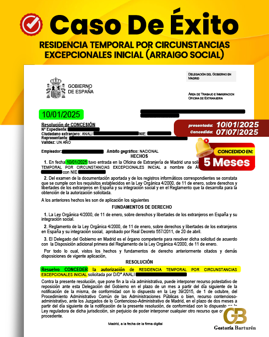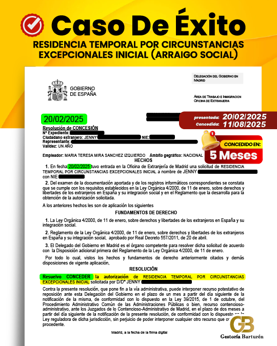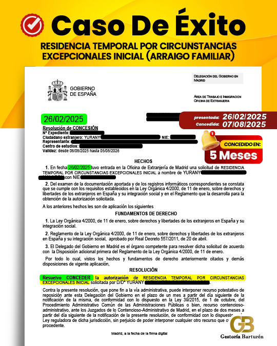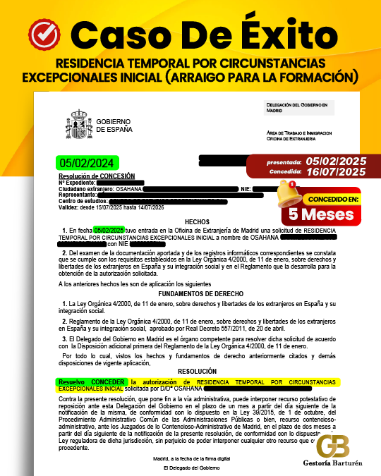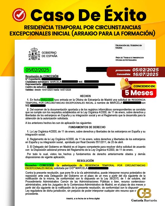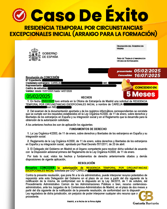 Caso de Éxito de OSAHANA en 5 Meses. RESIDENCIA TEMPORAL POR CIRCUNSTANCIAS EXCEPCIONALES INICIAL (ARRAIGO POR LA FORMACIÓN) Presentada: 05/02/2025 / Concedida: 16/07/2025
