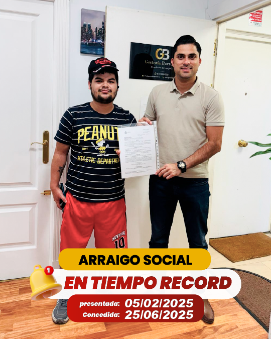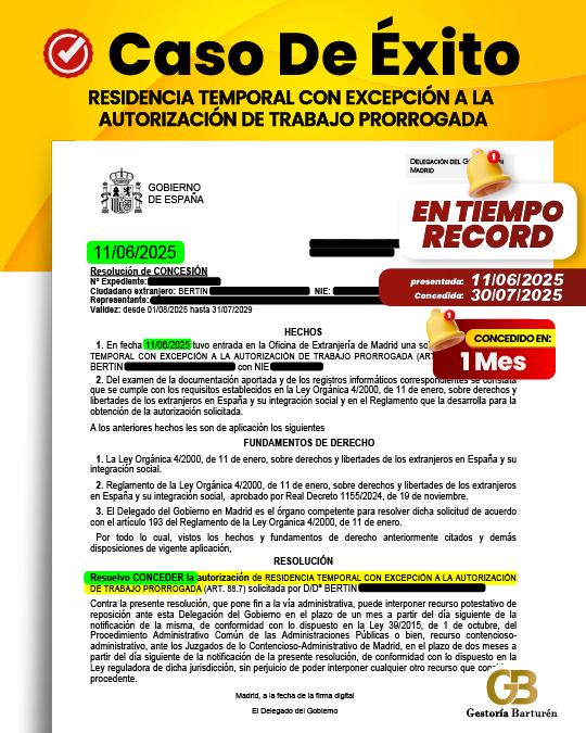 Caso de Éxito de BERTIN en tiempo record 1 Mes. RESIDENCIA TEMPORAL CON EXCEPCIÓN A LA AUTORIZACIÓN DE TRABAJO PRORROGADA Presentada: 11/06/2025 / Concedida: 30/07/2025
