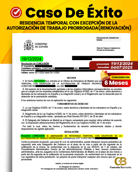 Caso de Éxito de CONSTANTIN en 6 Meses. RESIDENCIA TEMPORAL TEMPORAL CON EXCEPCIÓN DE LA AUTORIZACIÓN DE TRABAJO PRORROGADA (RENOVACIÓN)