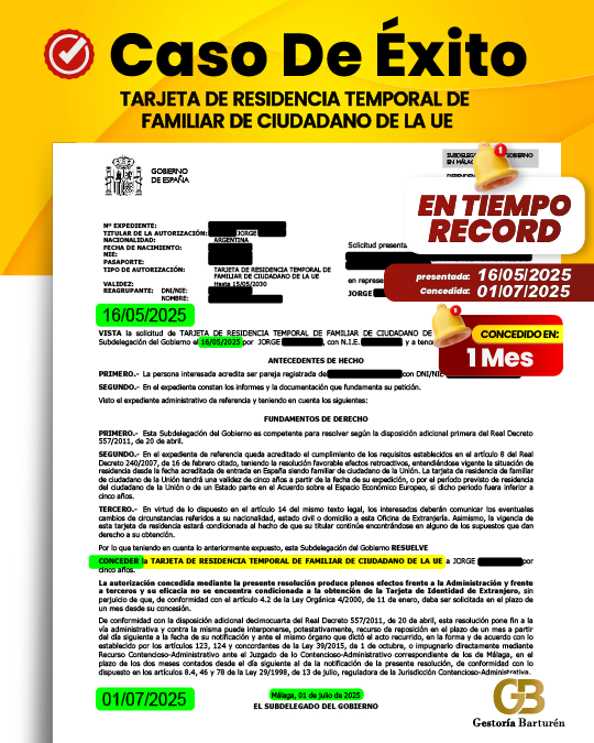 Caso de Éxito de JORGE en tiempo record 1 Mes. TARJETA DE RESIDENCIA TEMPORAL DE FAMILIAR DE CIUDADANO DE LA UE