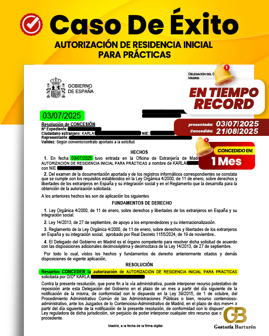 Caso de Éxito de KARLA en tiempo record 1 Mes. AUTORIZACIÓN DE RESIDENCIA INICIAL PARA PRÁCTICAS