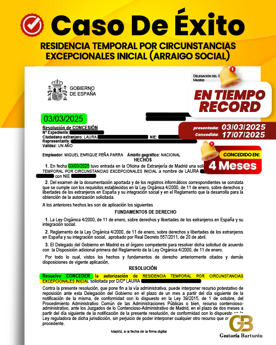 Caso de Éxito de LAURA en tiempo record 4 Meses. RESIDENCIA TEMPORAL POR CIRCUNSTANCIAS EXCEPCIONALES INICIAL (ARRAIGO SOCIAL) Presentada: 03/03/2025 / Concedida: 17/07/2025