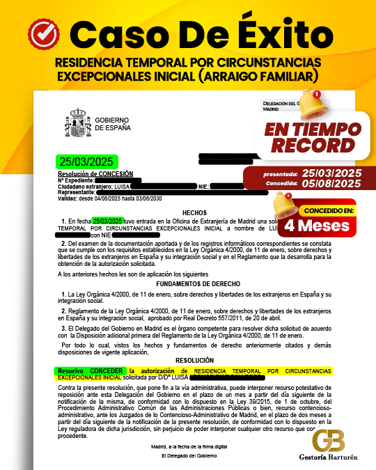 Caso de Éxito de LUISA en 5 Meses. RESIDENCIA TEMPORAL POR CIRCUNSTANCIAS EXCEPCIONALES INICIAL (ARRAIGO FAMILIAR)