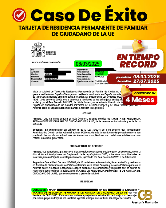 Caso de Éxito de MARIA en tiempo record 4 Mes. TARJETA DE RESIDENCIA PERMANENTE DE FAMILIAR DE CIUDADANO DE LA UE