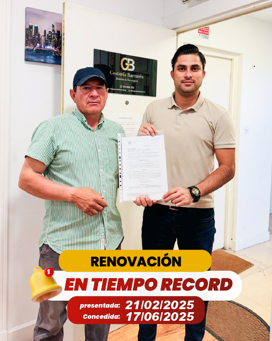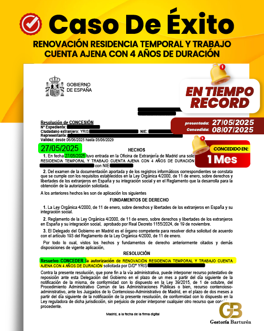 Caso de Éxito de YRIS en tiempo record 1 Mes. RENOVACIÓN RESIDENCIA TEMPORAL Y TRABAJO CUENTA AJENA CON 4 AÑOS DE DURACIÓN Presentada: 27/05/2025 / Concedida: 08/07/2025